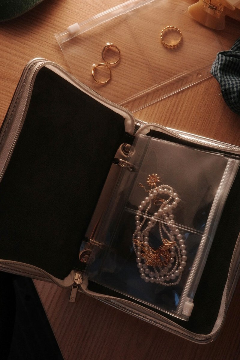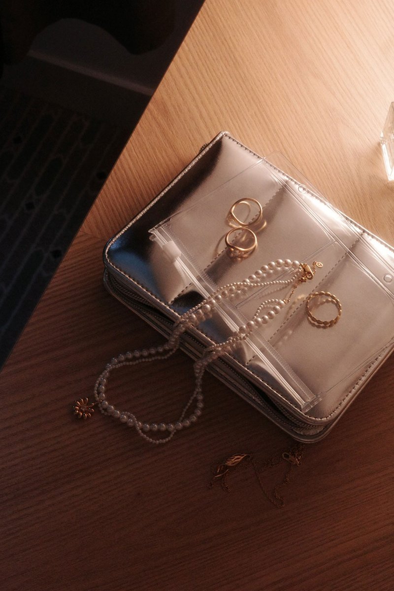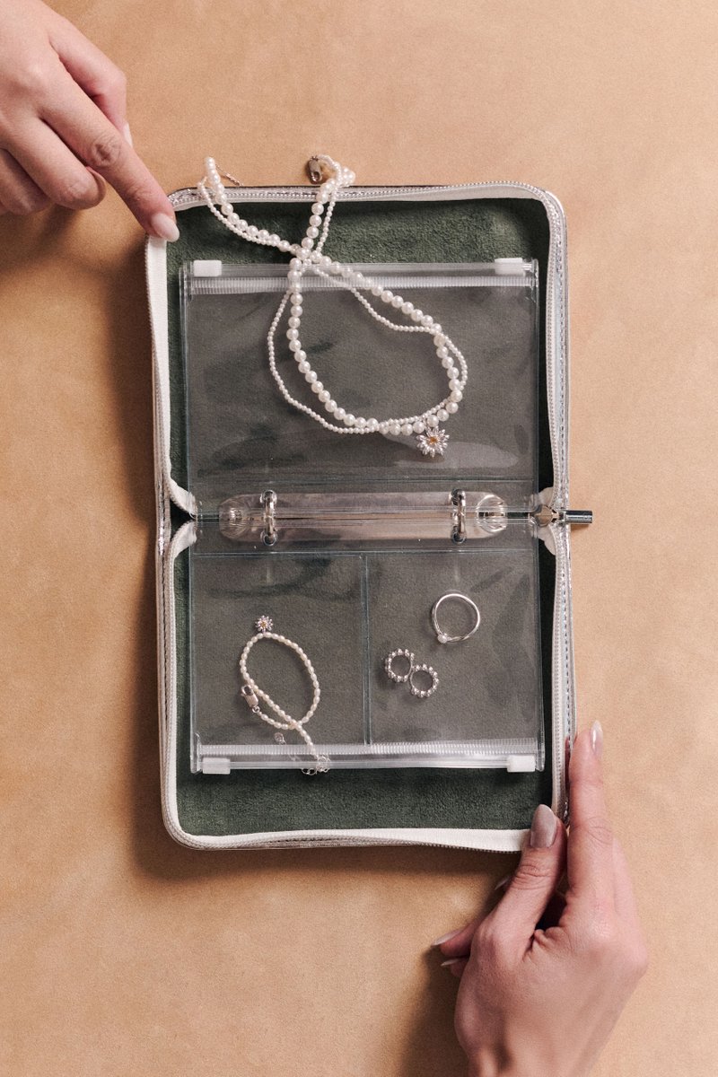 With its soft structure and roomy pockets, it stores jewelry, documents, and travel bits without the mess. Built to hold jewelry, tickets, receipts, and all the small things, it keeps everything in one place.