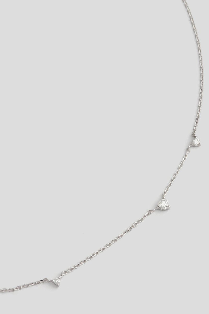 Subtle, modern, and striking in its simplicity — the Moiré necklace celebrates asymmetry with effortless elegance. Three tiny diamonds are thoughtfully scattered along a delicate chain, catching the light at every angle. Inspired by the rippled patterns of nature, this piece transforms minimal design into a statement of quiet sophistication. Wear it alone for a refined, contemporary look, or layer it to create a curated, editorial feel. Moiré is for those who embrace imperfection as part of beauty.