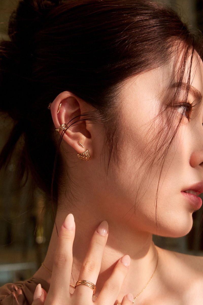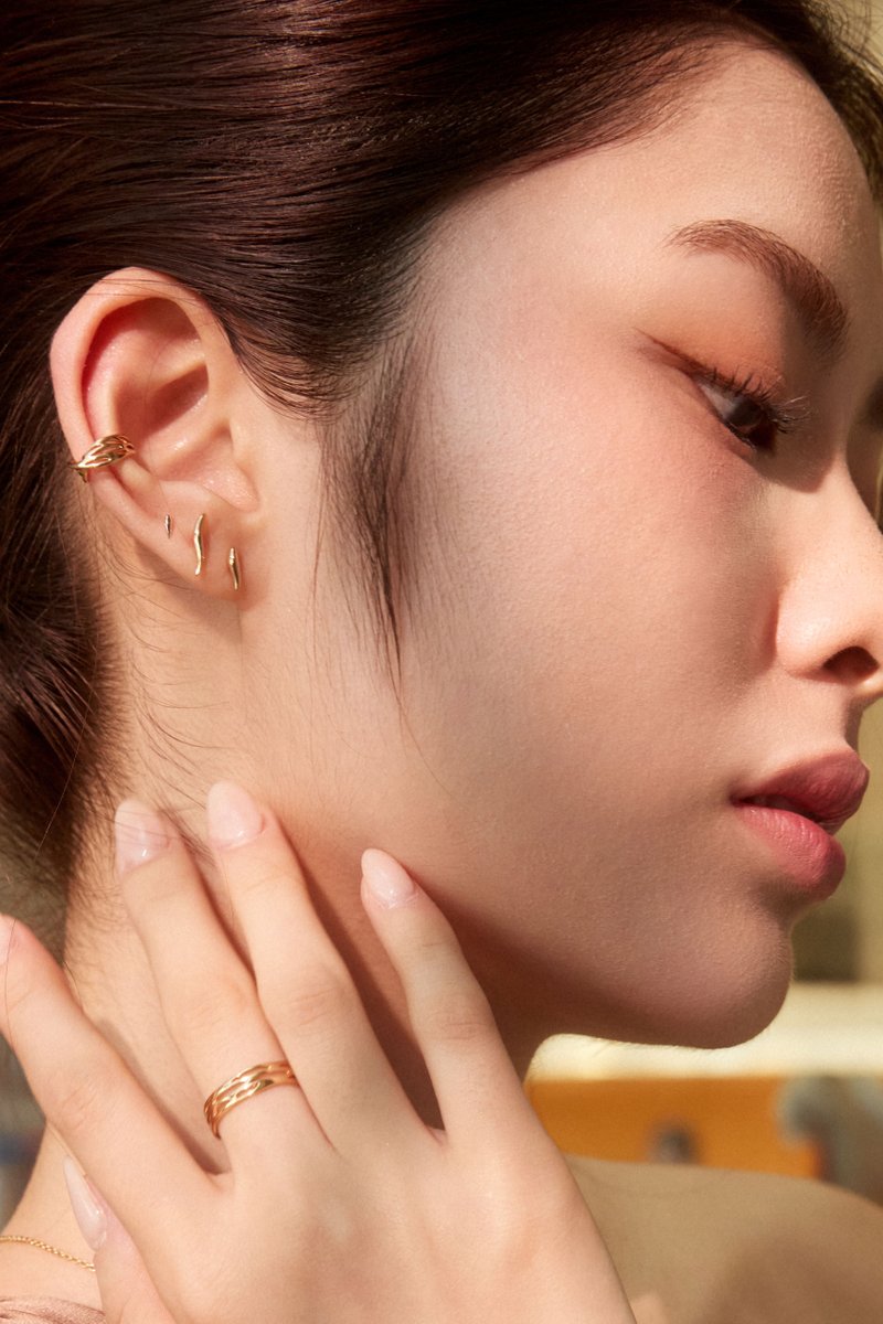 A trio of ear studs echoing the gentle waves and flowing lines of filigree — delicate forms designed to dance across the ear with effortless elegance.