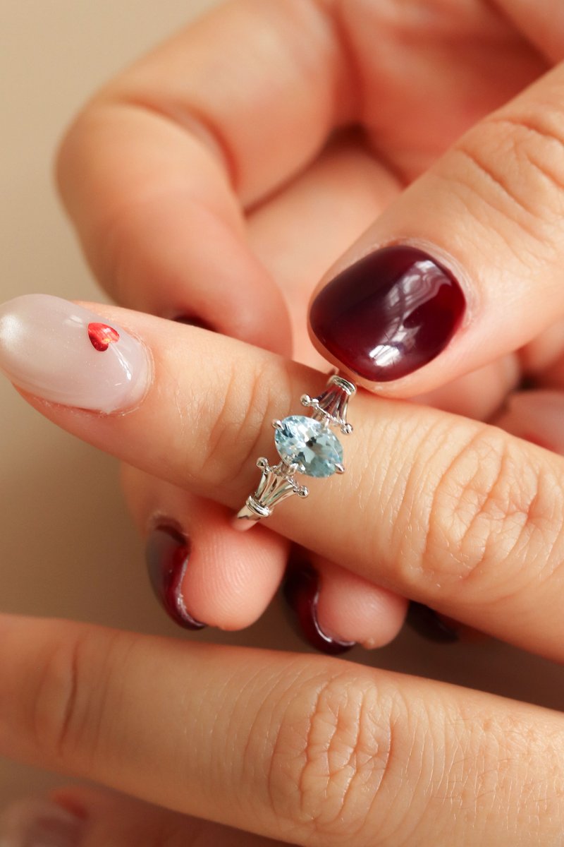 Celebrate refine elegance with the Cathedral Ring. Featuring a luminous, oval-cut gemstone nestled delicately between intricate floral-inspired prongs, this design capture the essence of timeless beauty. Let this be the pierce that turns every moment into a statement of grace.