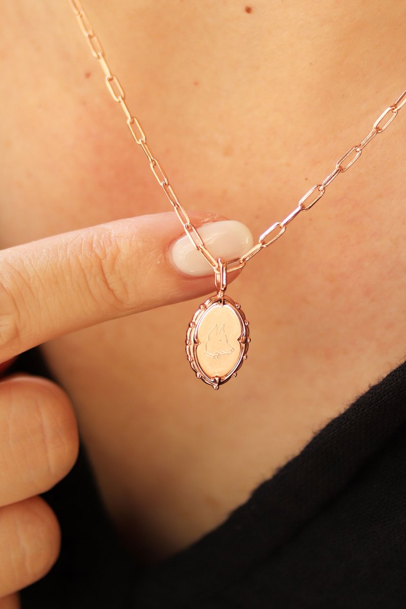 Like something out of a storybook, this mirror-shaped pendant captures quiet elegance and a touch of fantasy. Its polished surface and intricate edges feel both old and new — perfect for engraving your own truth within the frame.