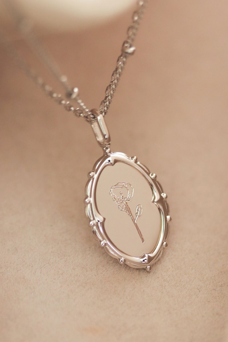 Like something out of a storybook, this mirror-shaped pendant captures quiet elegance and a touch of fantasy. Its polished surface and intricate edges feel both old and new — perfect for engraving your own truth within the frame.