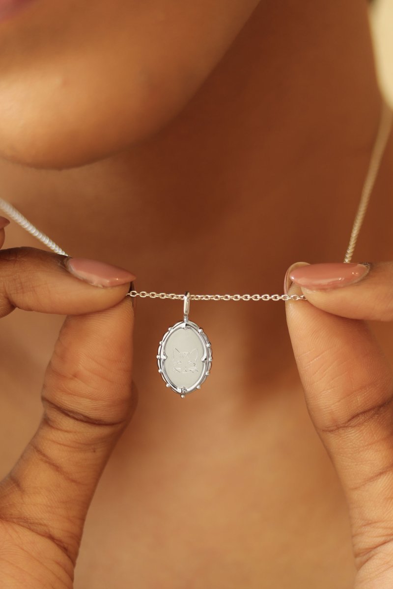 Like something out of a storybook, this mirror-shaped pendant captures quiet elegance and a touch of fantasy. Its polished surface and intricate edges feel both old and new — perfect for engraving your own truth within the frame.