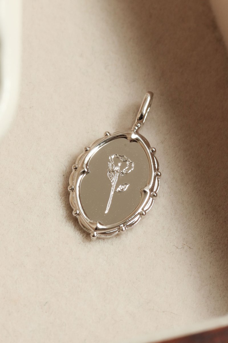 Like something out of a storybook, this mirror-shaped pendant captures quiet elegance and a touch of fantasy. Its polished surface and intricate edges feel both old and new — perfect for engraving your own truth within the frame.