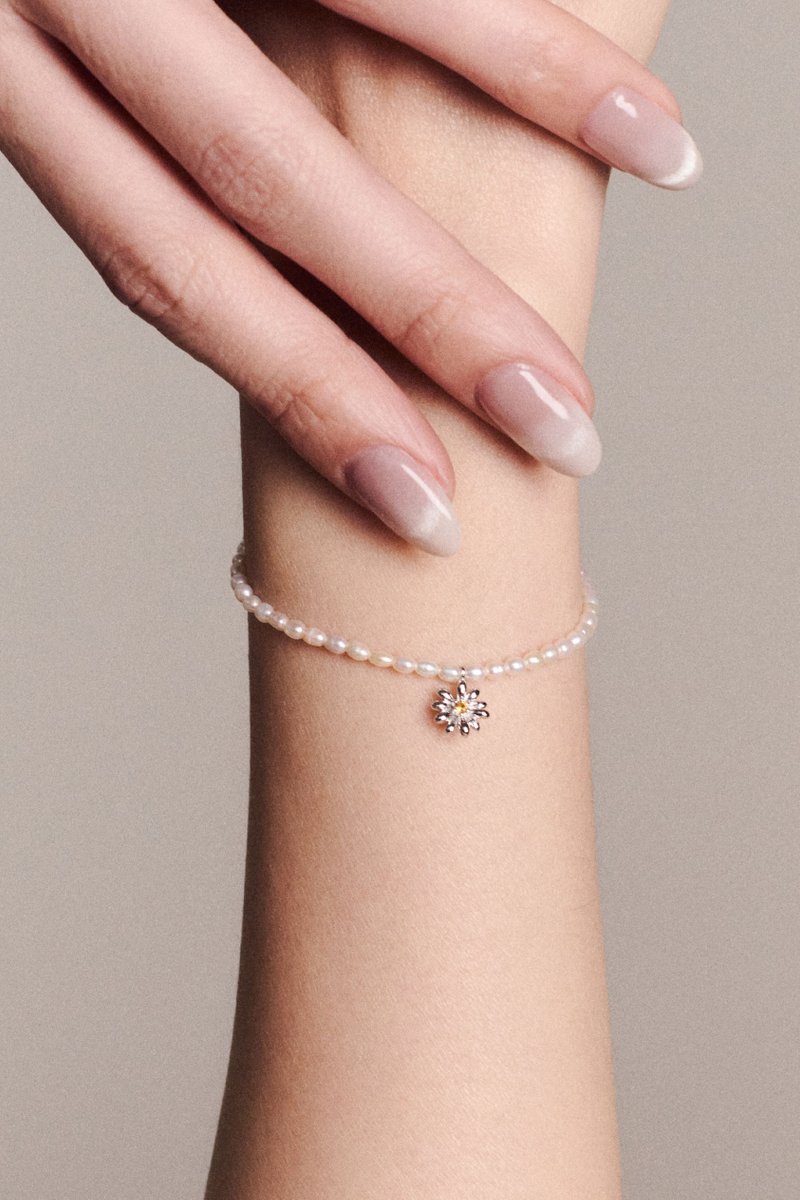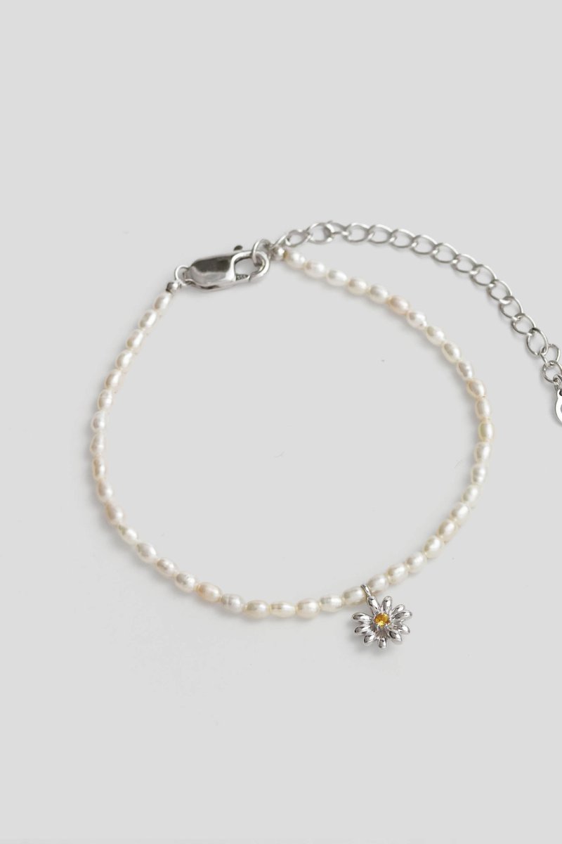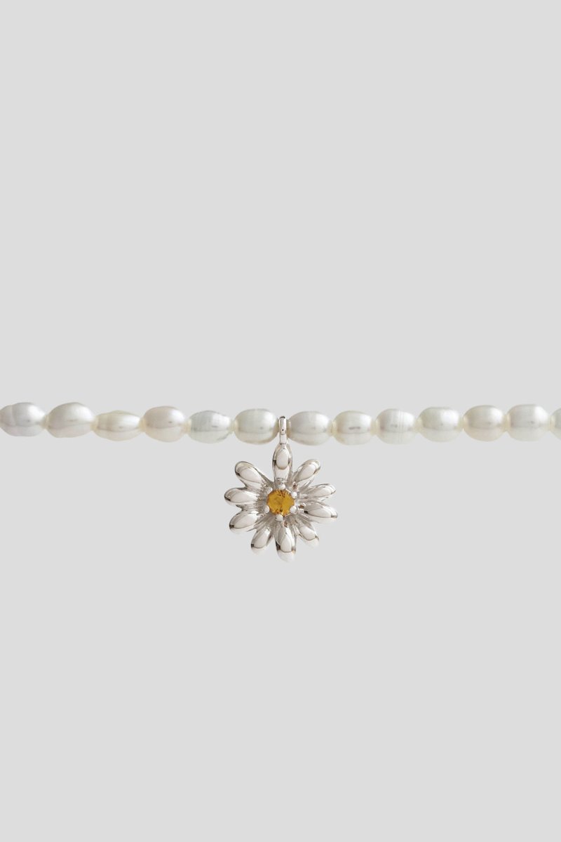 A single strand of pearls wraps neatly around the wrist, anchored at the centre by a daisy with a citrine that adds a gentle sparkle. An easy statement that works with anything, for any day. Wear it stacked for that cool, effortless edge, or let it sit alone for a clean and refined finish.