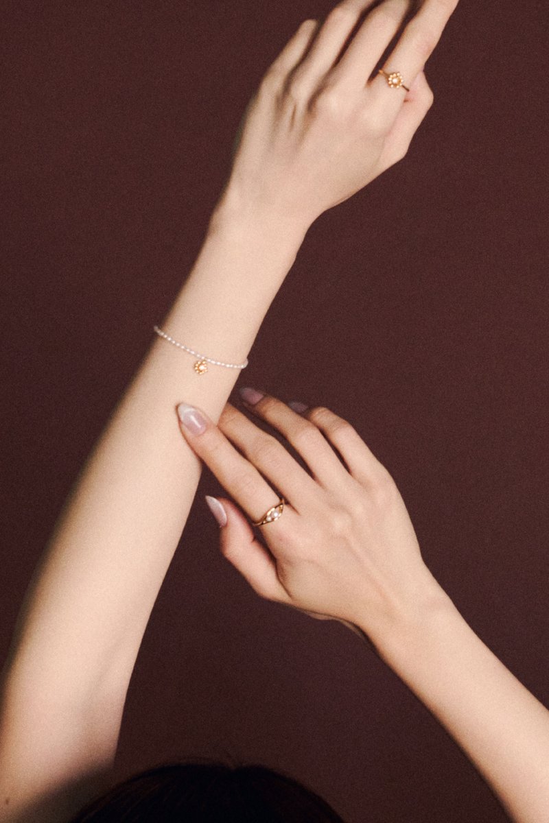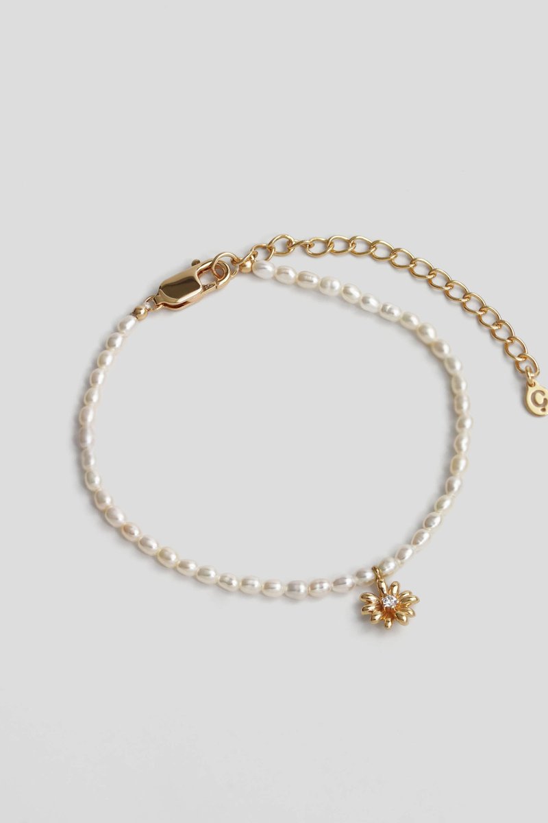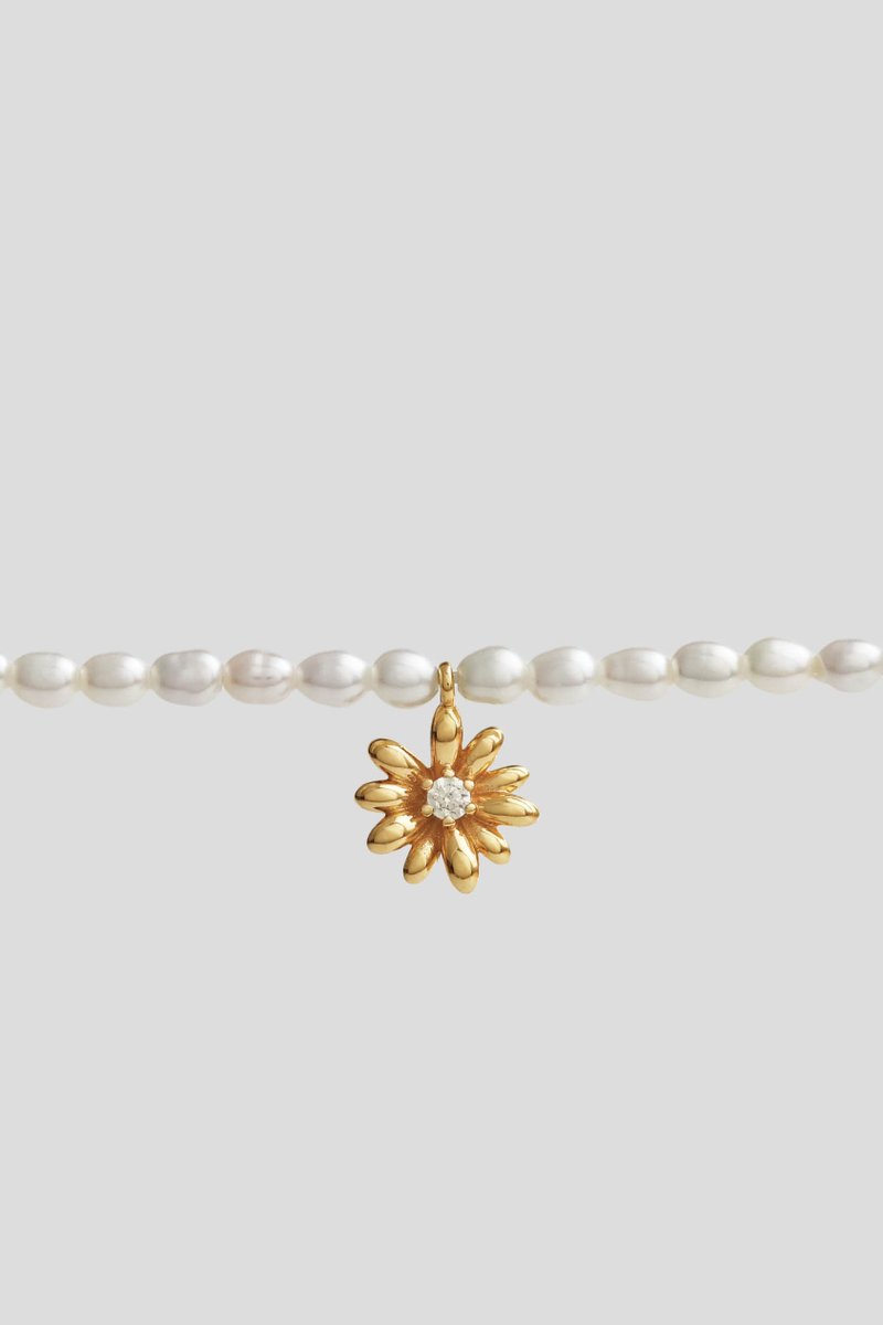 A single strand of pearls wraps neatly around the wrist, anchored at the centre by a daisy with a white topaz that adds a gentle sparkle. An easy statement that works with anything, for any day. Wear it stacked for that cool, effortless edge, or let it sit alone for a clean and refined finish.