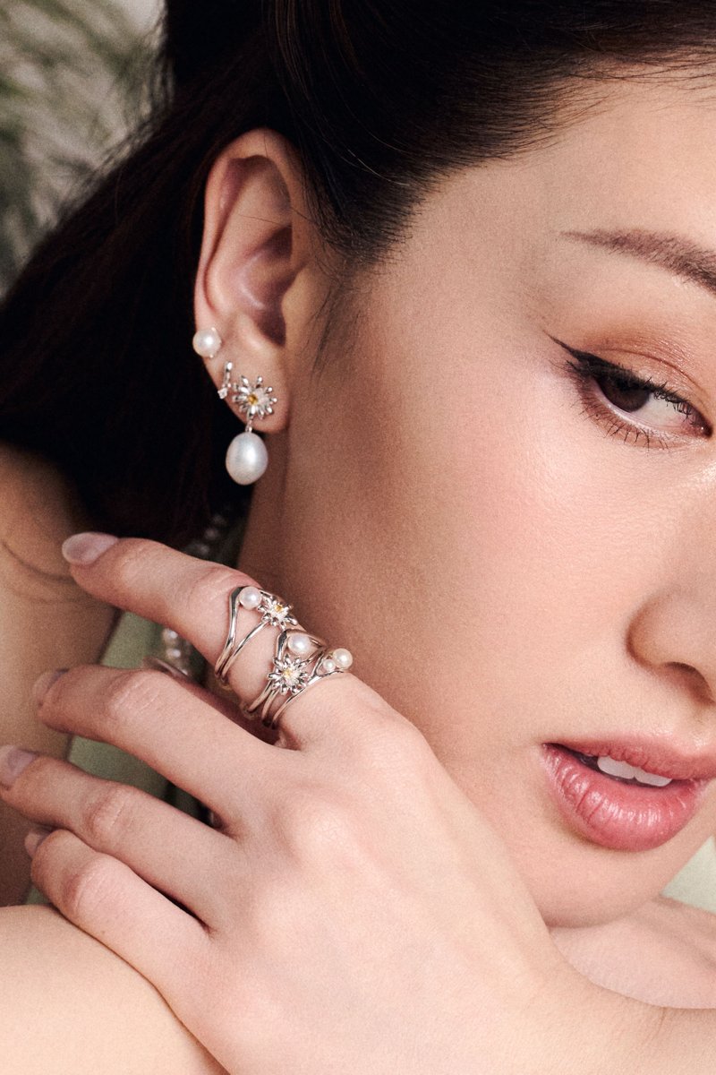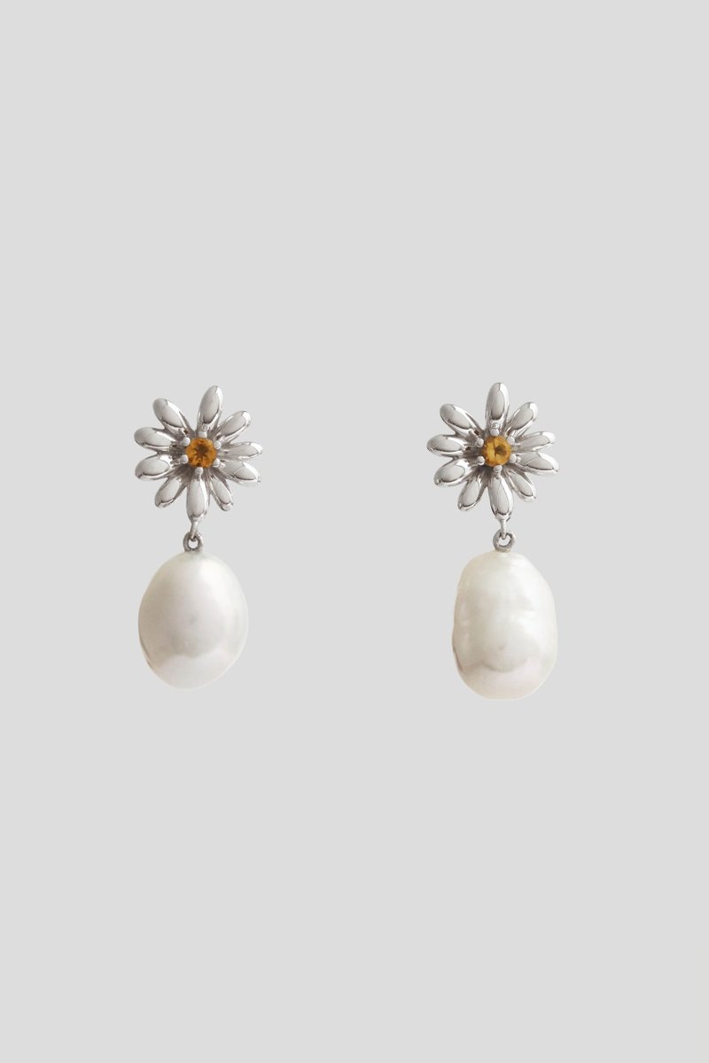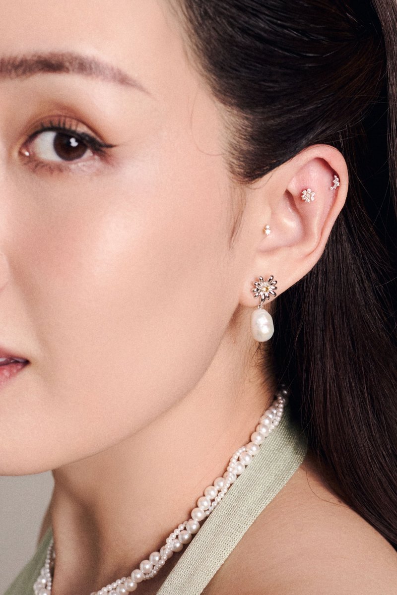 A daisy stud sits at the ear, with a baroque pearl dropping below for a touch of movement and subtle shine. A statement without trying too hard — polished, easy, and instantly elevating. Pair them with a slick bun for a clean, modern look, or wear them with loose waves for relaxed elegance.