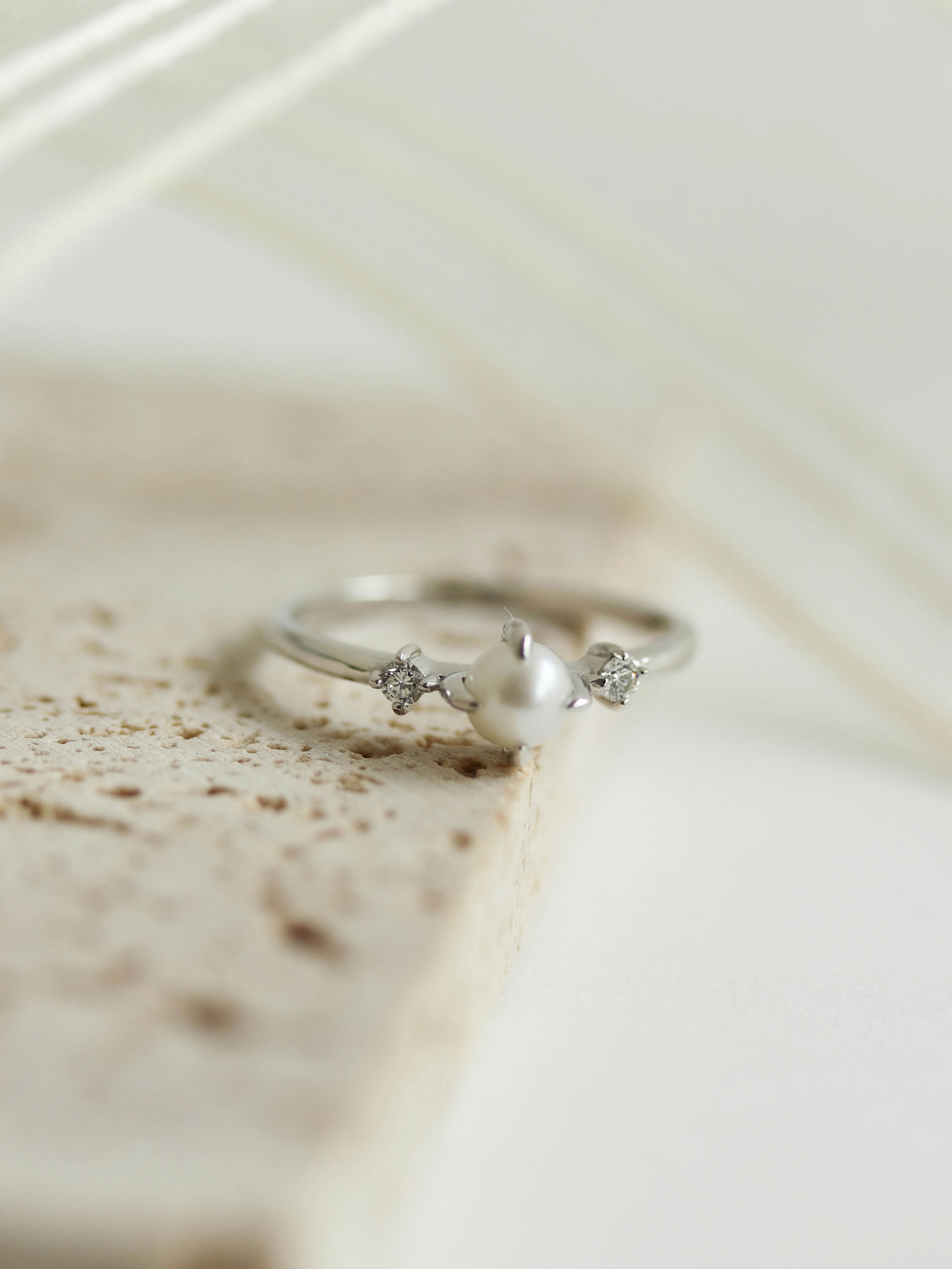 Ostrea Ring - White Round Pearl & Diamond in 14k White Gold